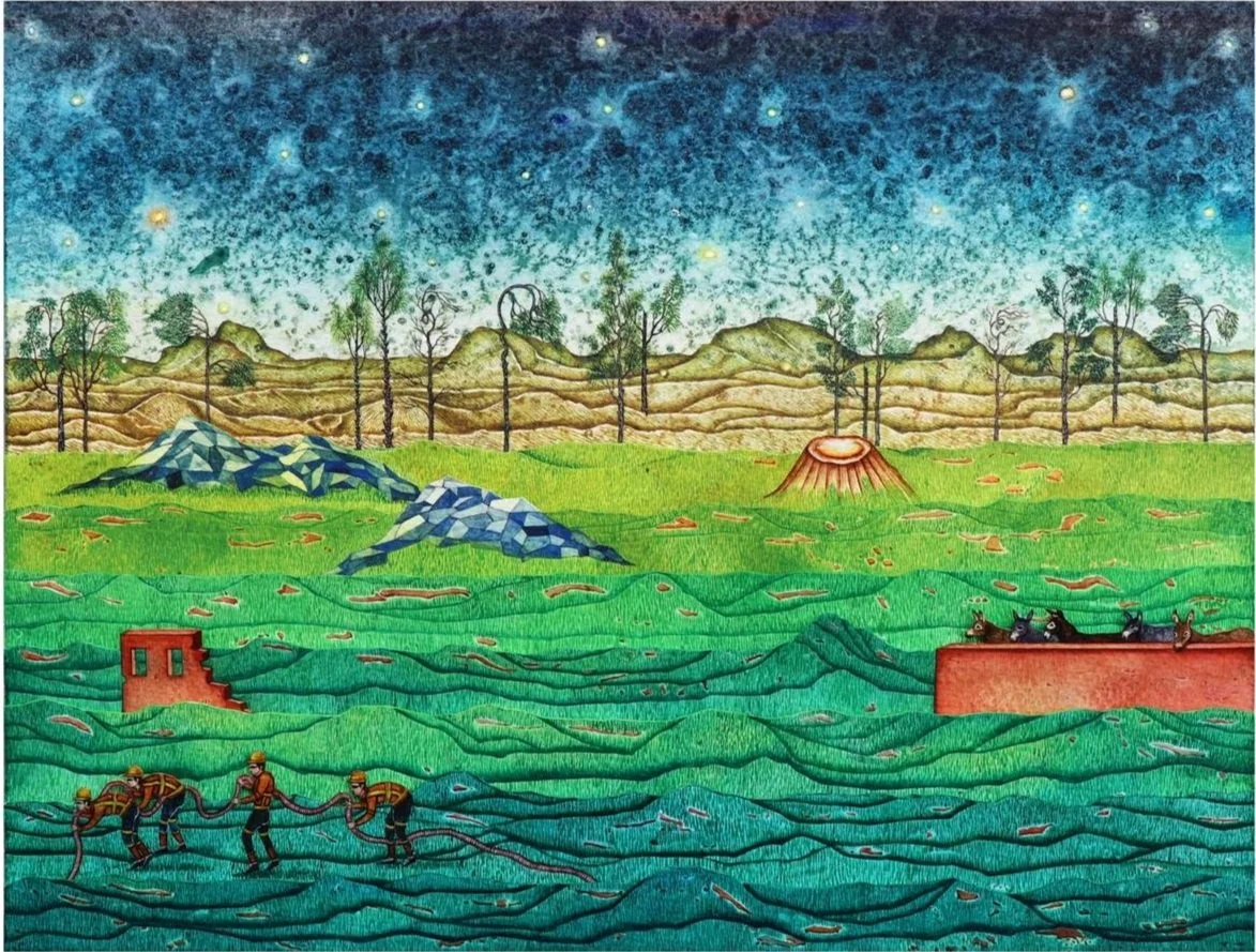 The artist talks about his village, reminiscing days when he was still a child and would accompany his mother, a teacher at aanganwadi (play school), to create traditional patterns with golam (rice powder) on the walls of their home. Digbijayee, the eldest of his siblings, would often accompany his father, a history teacher, to ancient monuments in Odisha, a place historically and culturally rich with temples, caves and Pattachitra (or Patta) art style. While still very young he gravitated towards art. His initial works included realistic landscapes, portraits of people in royal costumes and of workers. In his oeuvre one finds allusions to the Patta technique, and in its mythological storytelling, fixed form, robust hues and floral motifs, Khatua renders a contemporary take on the style.