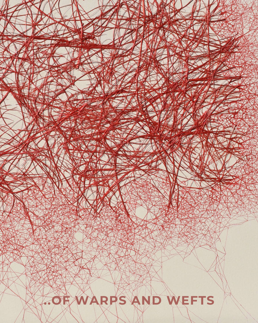 "..of warps and wefts", brings together works by Dhara Mehrotra to iterate a collision of science and art to explore a universe of possibilities, truths, and nature. Research studies indicate that one spoon of soil carries more living organisms than the entire human population on this planet. Dhara, intrigued and informed by facts like these, observes the invisible underground networks of micro-organisms performing through a microscope. She translates the systematic transmutations and modifications of patterns into visuals outside of the perceived and prevalent notions of existence. The works range across media- canvas and acrylic, paper and ink, with tactile layers of fiber, wherein each entity forms a web of stories, poetry and movement. Embedded in the fabric of life and underlined by socio-political textures, these elements represent fragile threads that often miss the eye, but inform our thought processes, activities and reactions. The gossamer of relationships in these clusters hint at the prevalent ambiguity that connect us all. Mycelium networks that sustain the natural vegetation on this planet highlight the easily forgotten micro-world capable of self-organisation, debunking the idea that human beings remain at the behest of all structural activities.